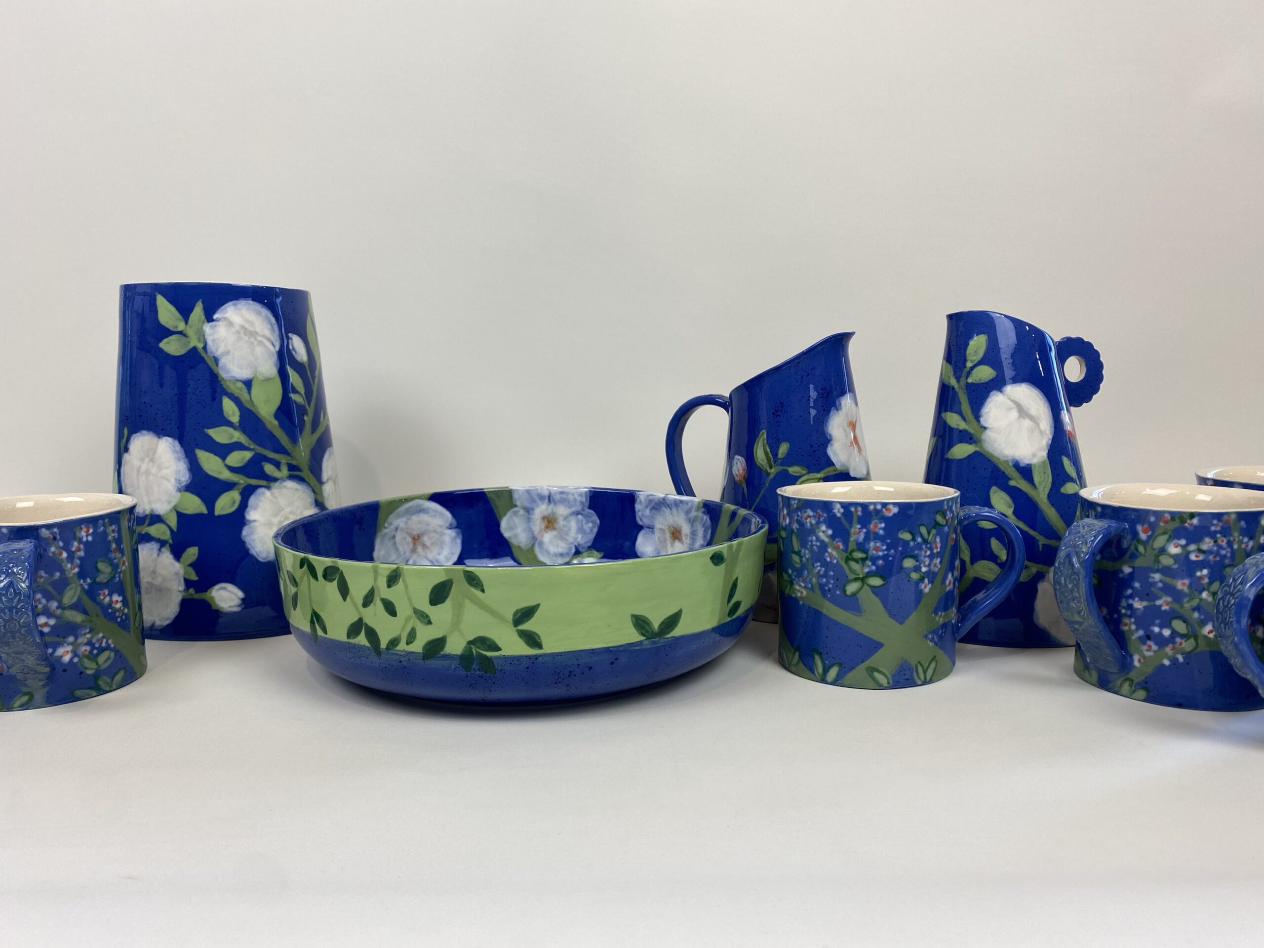 Handmade using white or terracotta earthenware clay, decorated with coloured engobe slips and oxides and finished using a glossy glaze. For purely decorative pieces areas may be left unglazed and finished with a wax. I work in small batches mixing the colours as I go, therefore sets may vary slightly.