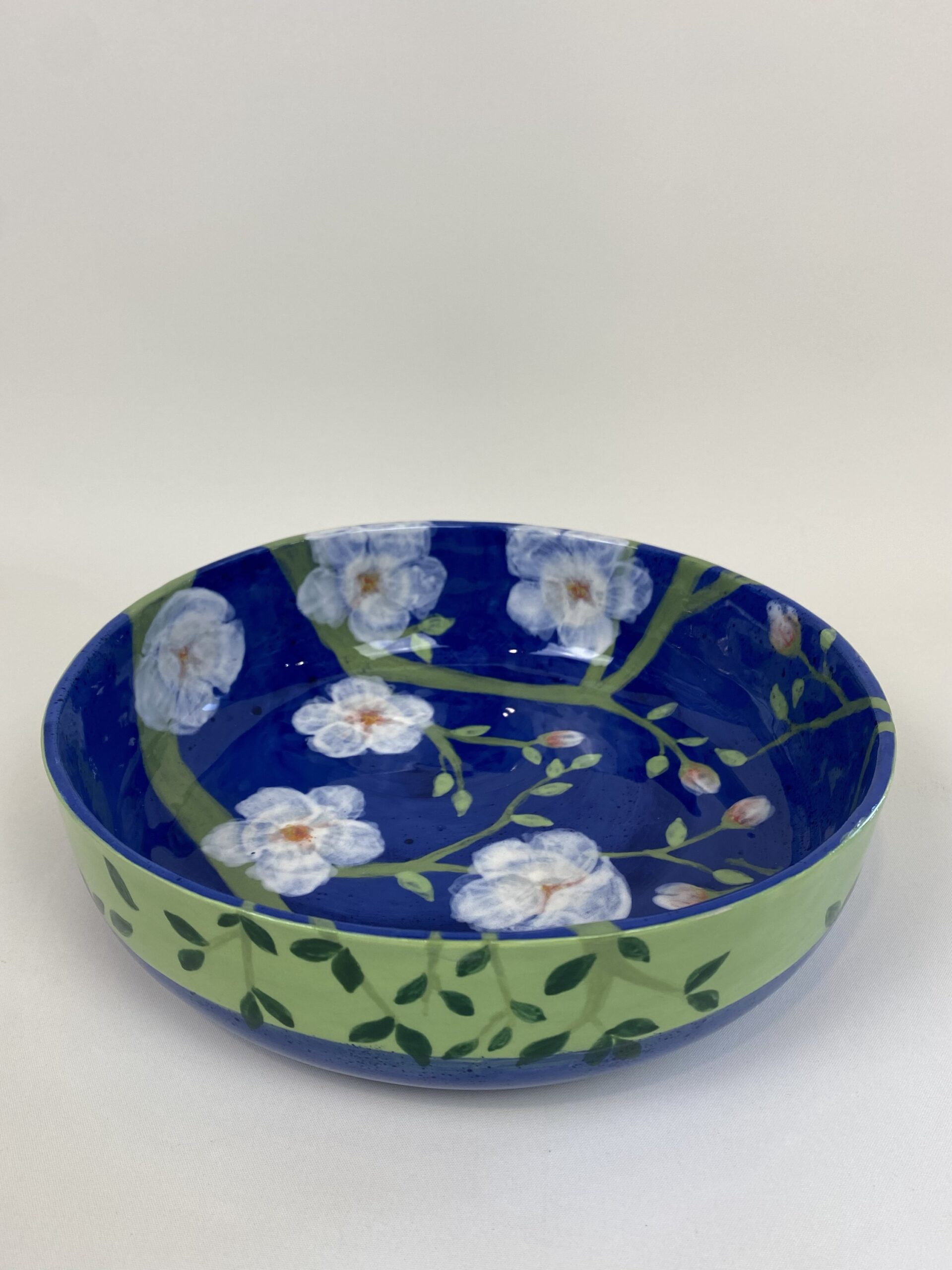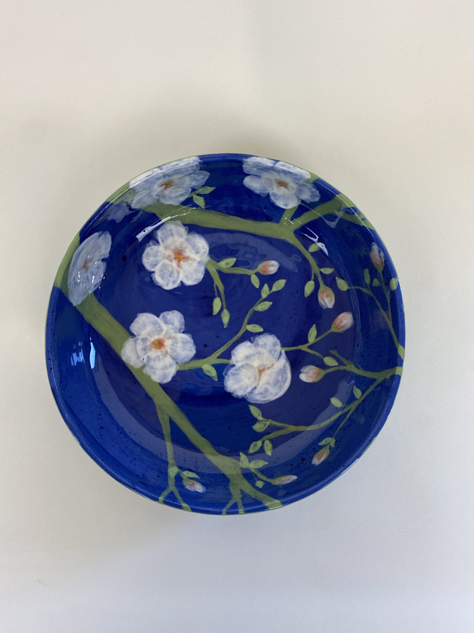To decorate i used a few blues for the vibrant base colour with a speckle to add interest. I painted on the blossom and stems with a selection of brushes to create a more realistic design.