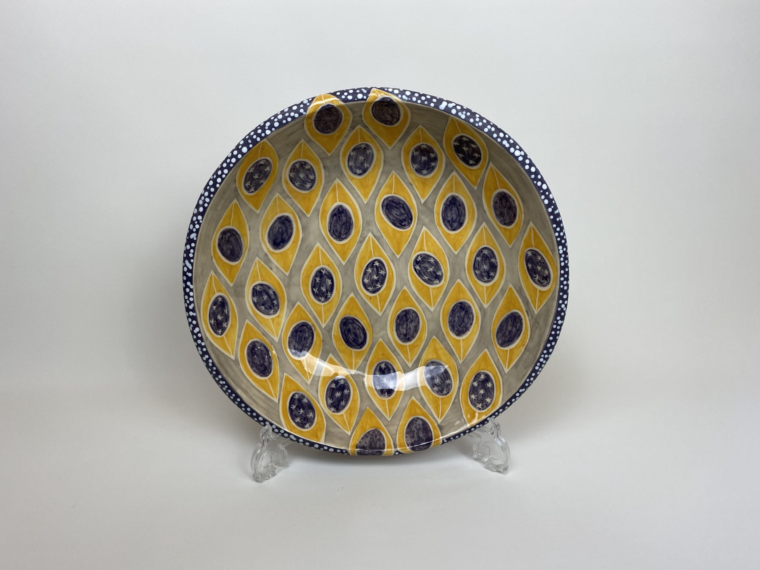 I started by rolling out a slab of clay, then pressed it into a plaster mould and attached a coiled rim. To decorate I used a number of engobe slips. I masked out the baubles by using a paper resist technique, I then painted on the grey background. I used yellow to fill in. I scratched through the purple to reveal the white clay body underneath. This technique is called sgraffitto. I used a thicker version of a white slip to make a slightly raised pattern on the rim. The outside is decorated with coloured engobe slips. I used a gloss glaze to finish.