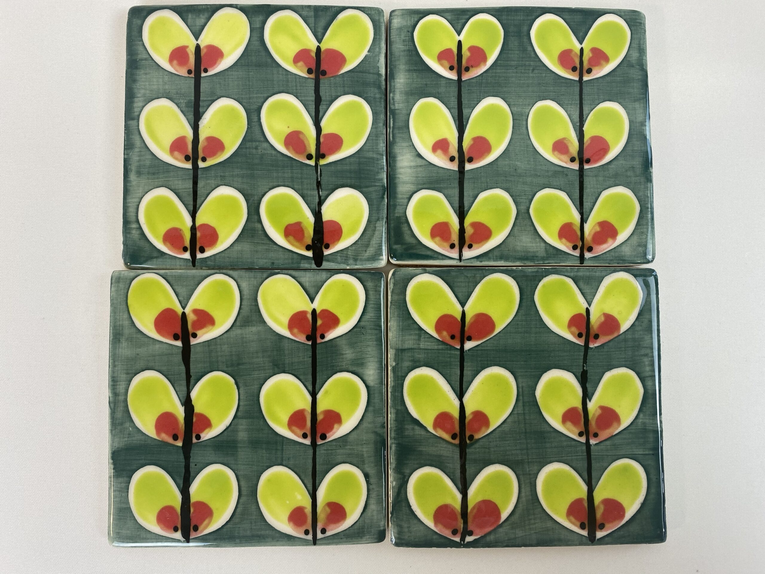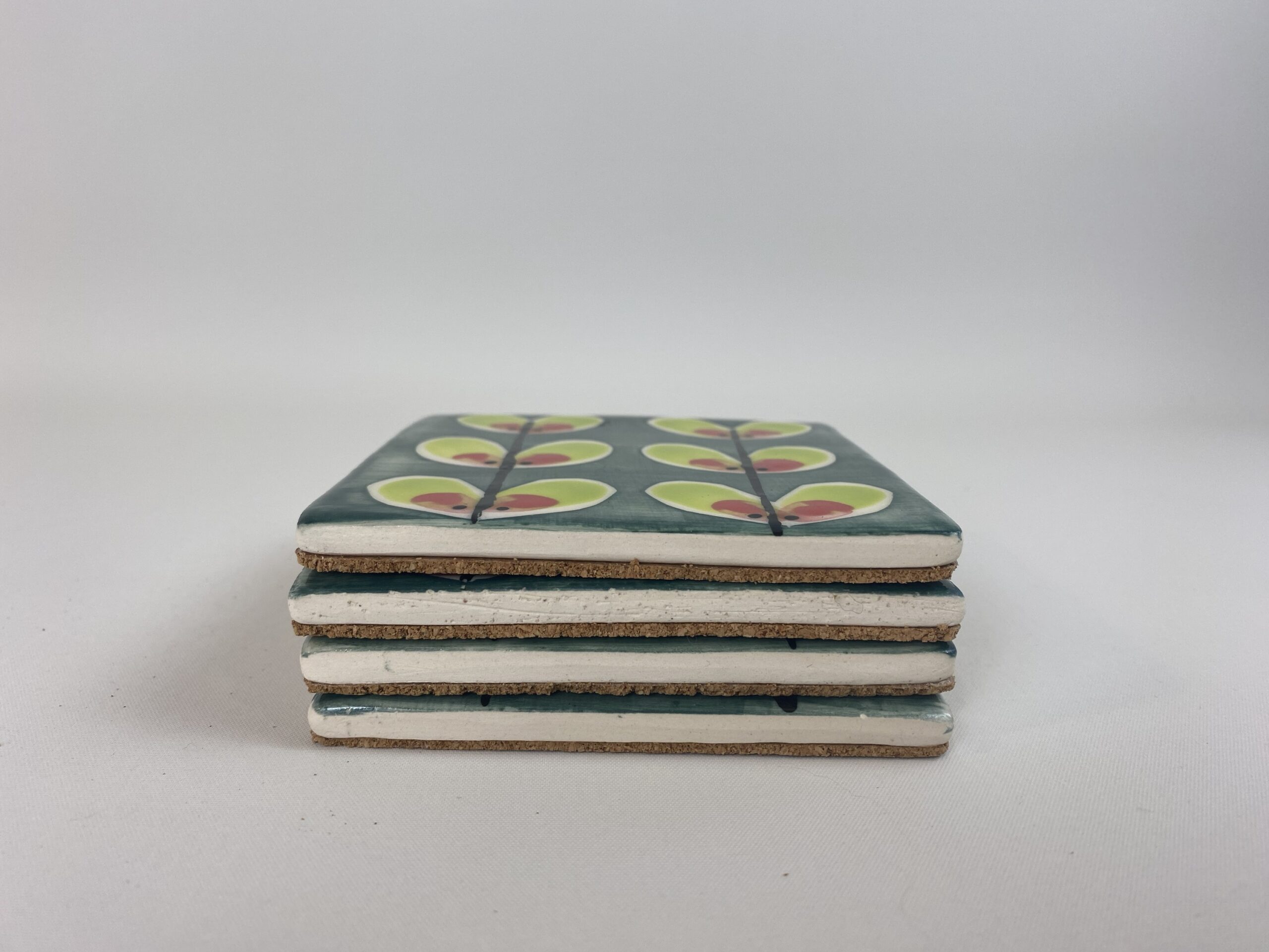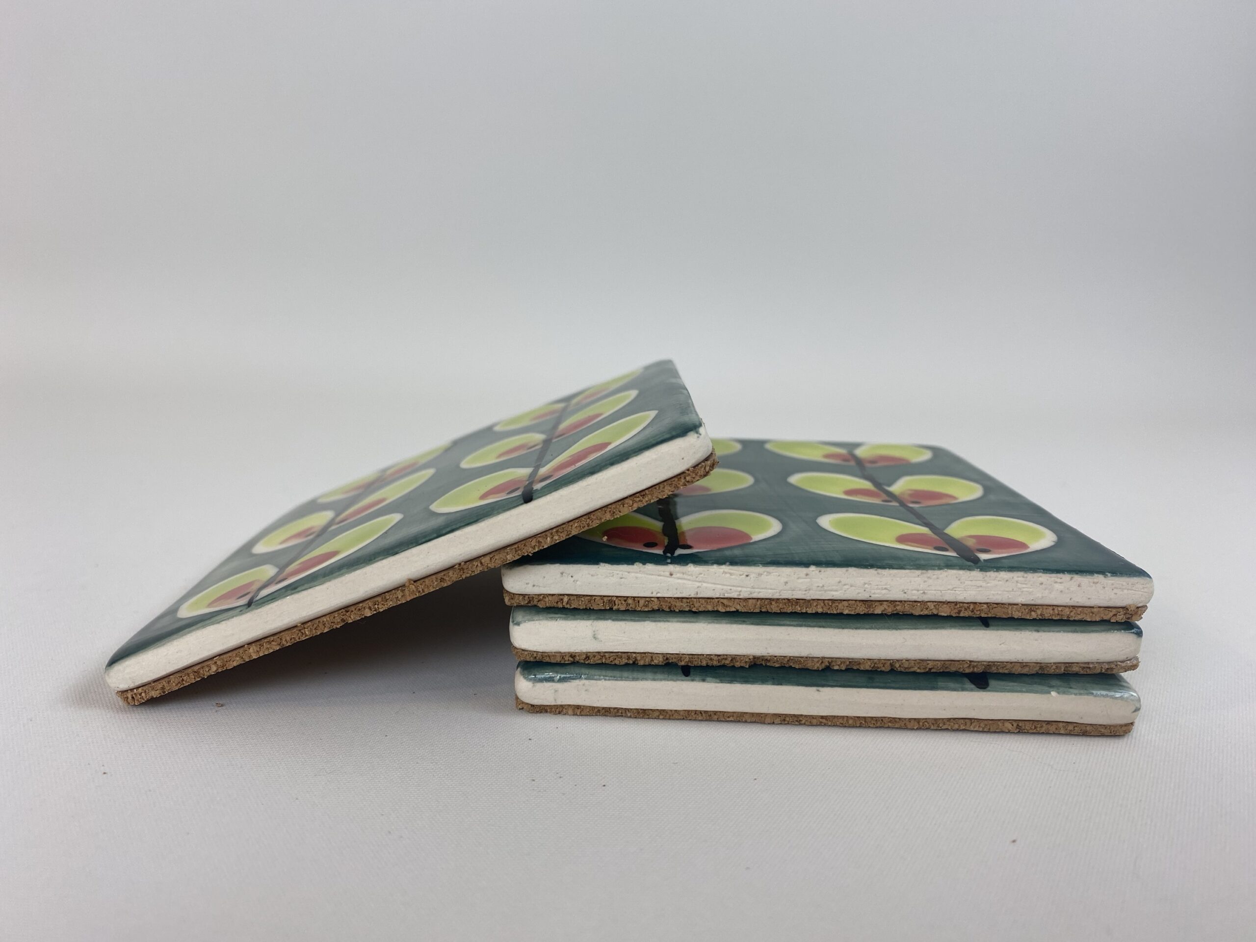 Handmade using white earthenware clay and decorated using a combination of coloured engobe slips (liquid clay that will fire and stick onto the body of the pot without the need of being covered with glaze) and oxides. Finished using a combination of an earthenware gloss glaze, (coloured or transparent) and unglazed areas which are sometimes waxed. I rolled out a slab of clay, cut out the shapes using a tile cutter and sponged the edges. To decorate I used paper to mask out areas and then I painted over with coloured engobe slips. I used a transparent gloss glaze to finish off.