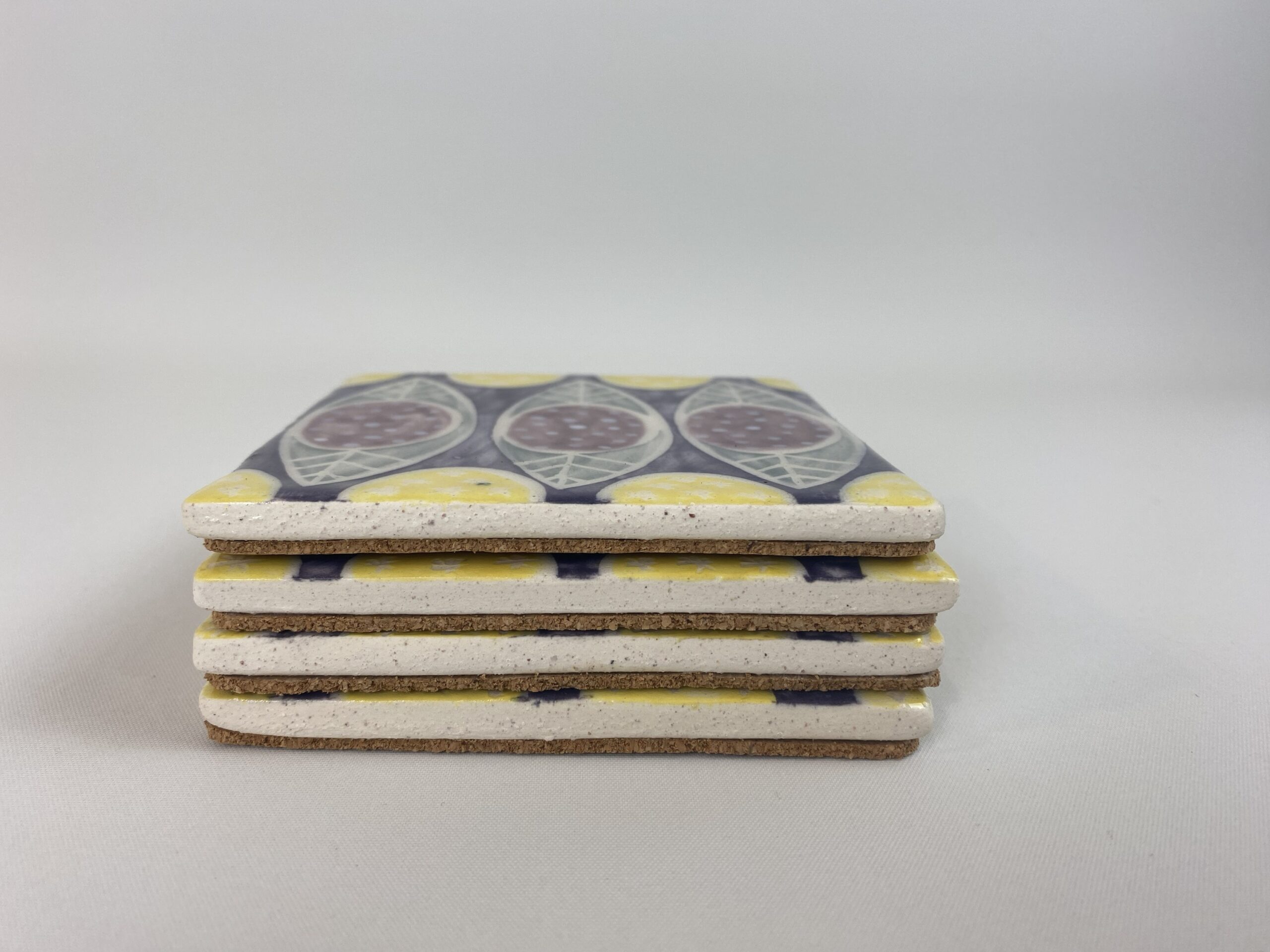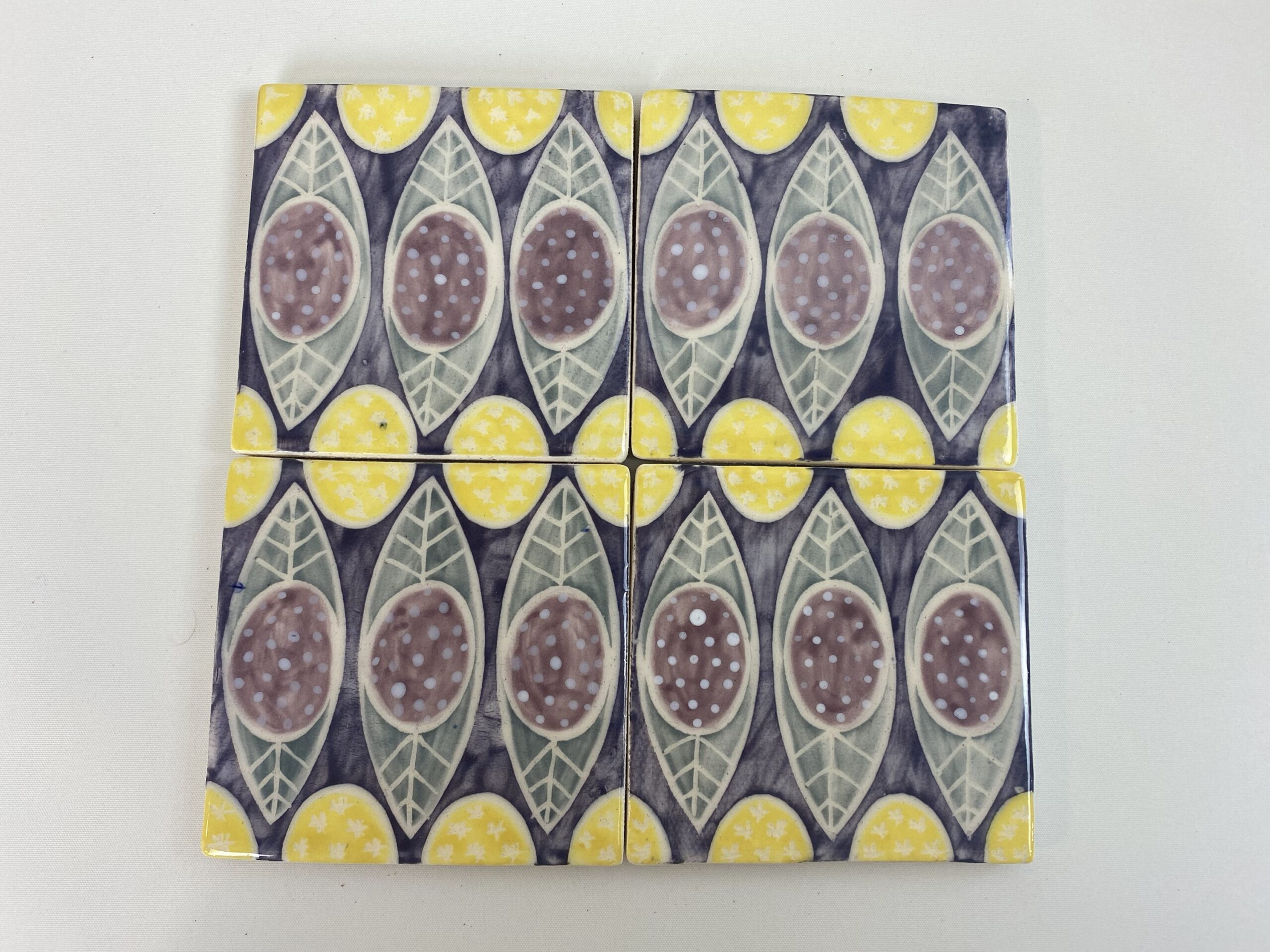 Handmade using white earthenware clay and decorated using a combination of coloured engobe slips (liquid clay that will fire and stick onto the body of the pot without the need of being covered with glaze) and oxides. Finished using a combination of an earthenware gloss glaze, (coloured or transparent) and unglazed areas which are sometimes waxed. I rolled out a slab of clay, cut out the shape using a tile cutter and sponged the edges. To decorate I used paper to mask out and coloured engobe slips to create the pattern. I scratched out some detail using the sgraffitto method. I then used a transparent gloss glaze to finish.
