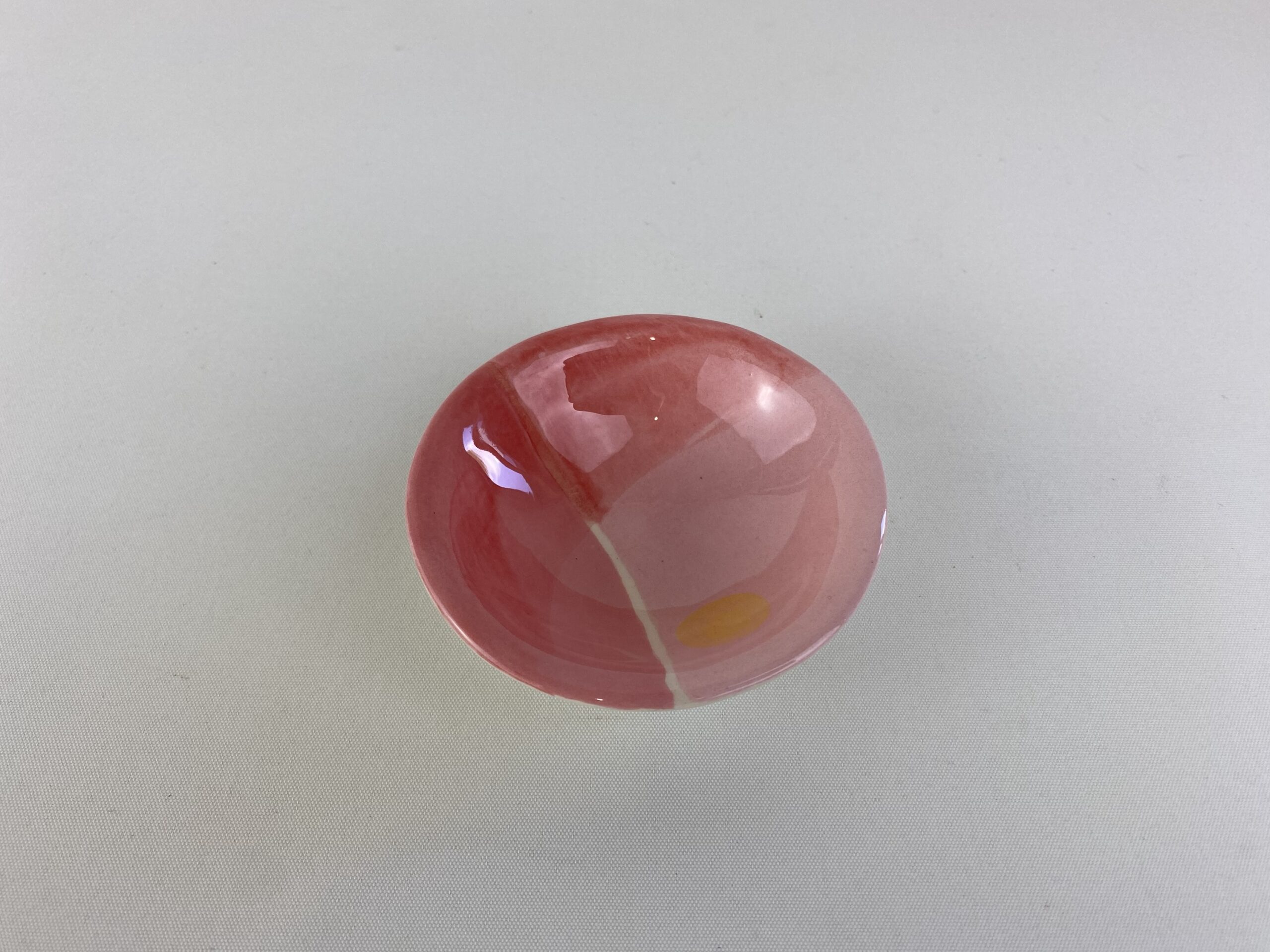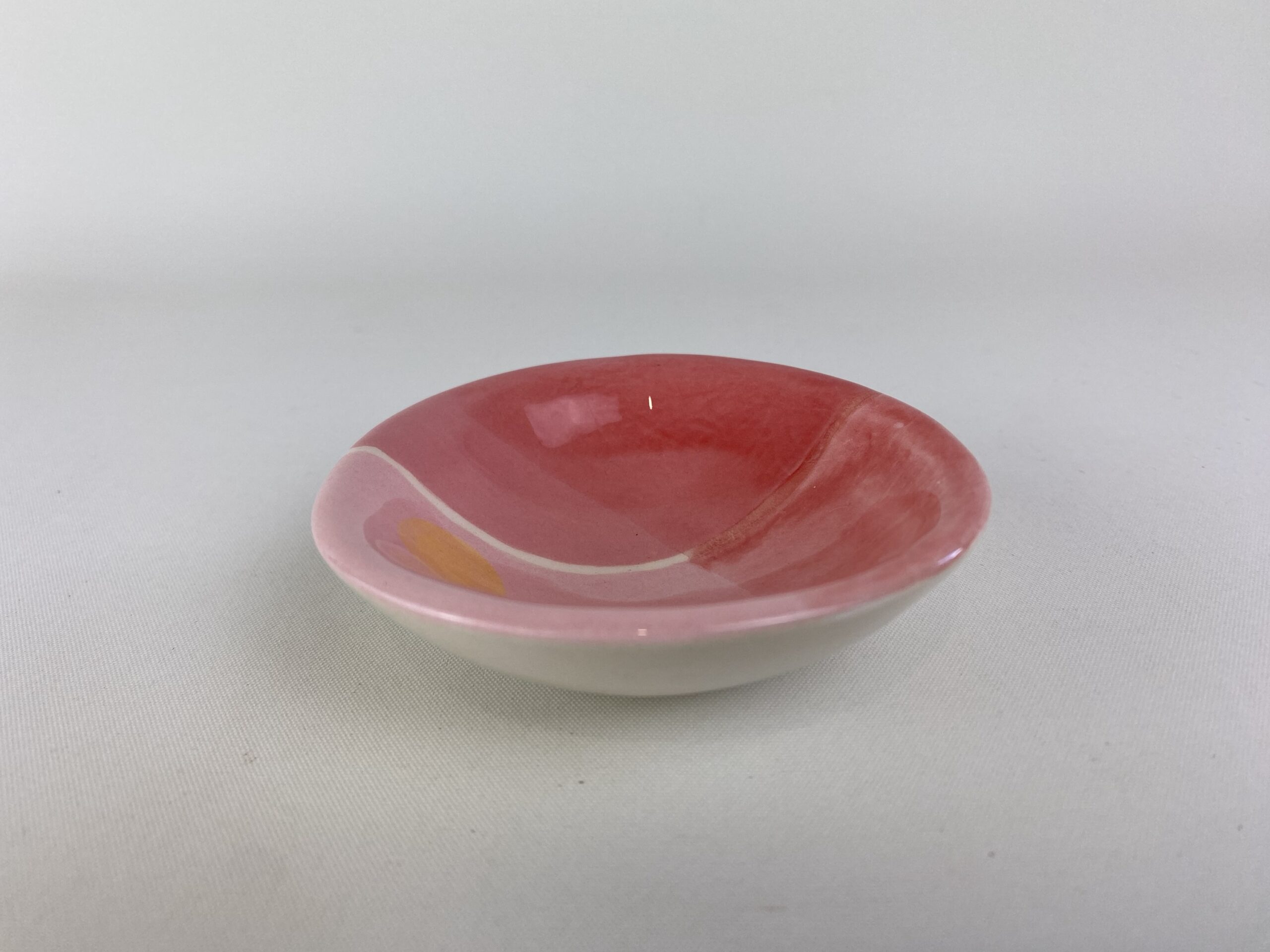 For this mini bowl I used white earthenware clay which I rolled out, cut and shaped in a plaster press mold. To decorate I painted on a variety of pinks and employed a few decorative techniques eg. Sponging, mono printing and layering with washes. To finish I used a gloss glaze.