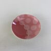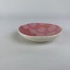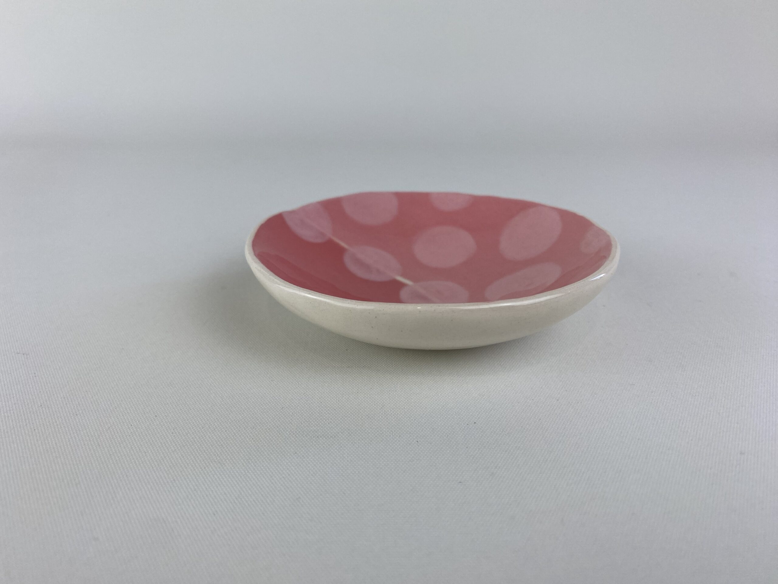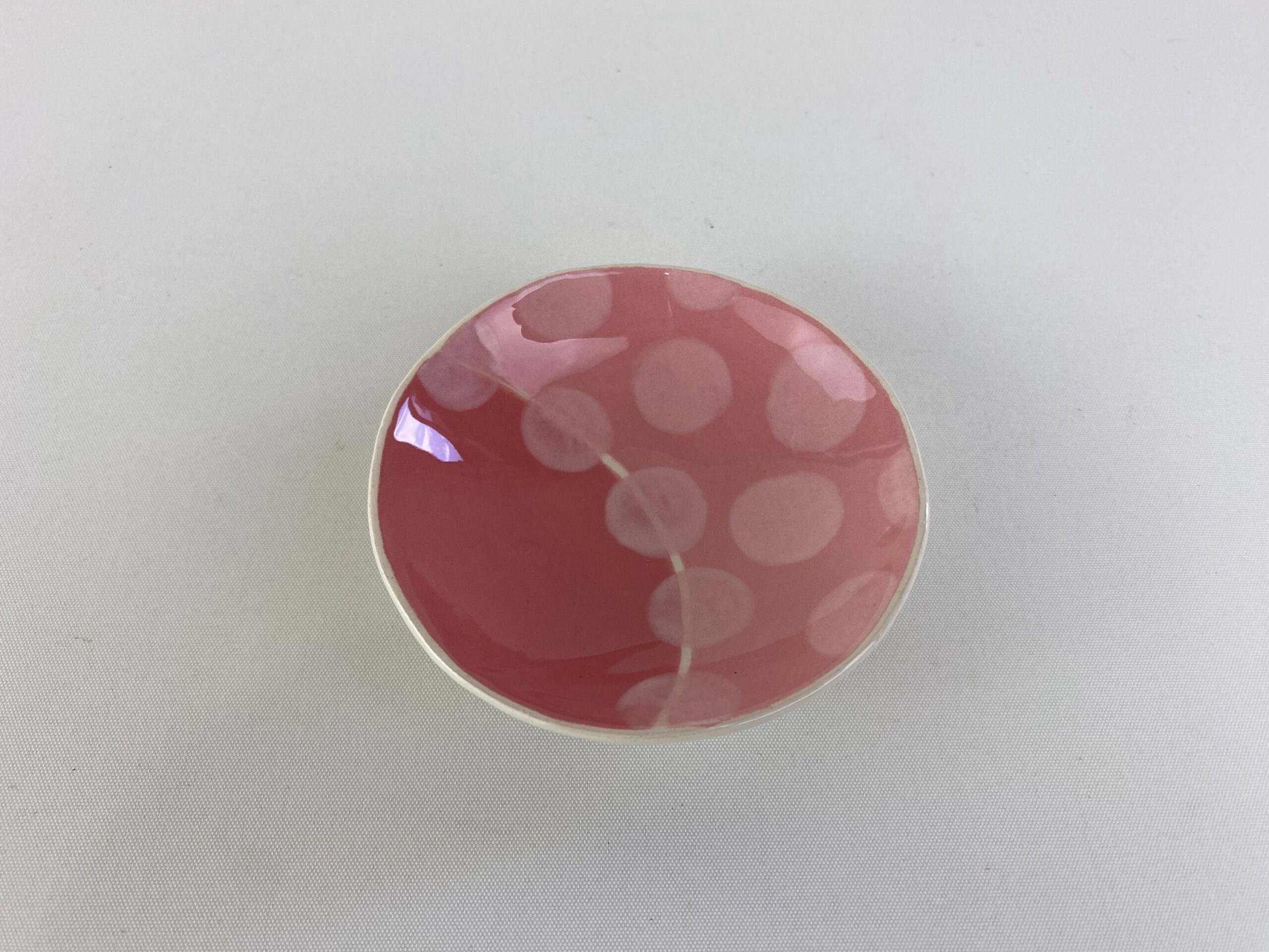 For this mini bowl I used white earthenware clay which I rolled out, cut and shaped in a plaster press mold. To decorate I painted on a variety of pinks and employed a few decorative techniques eg. Sponging, mono printing and layering with washes. To finish I used a gloss glaze.
