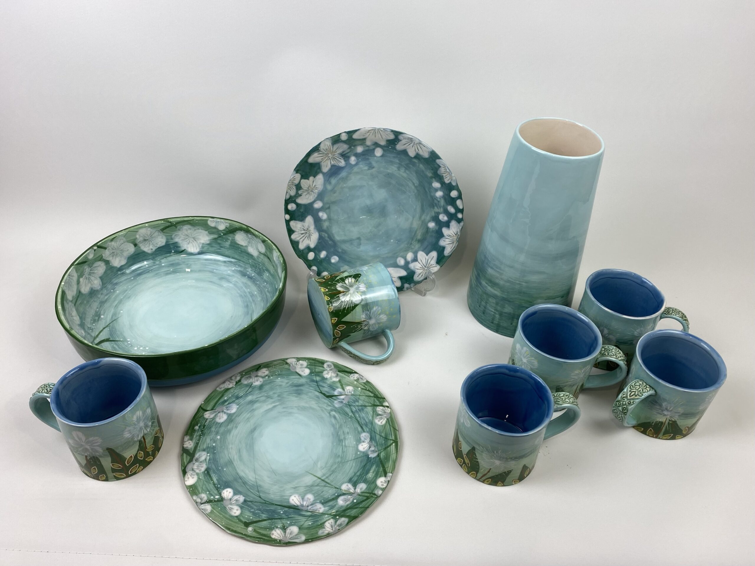 Handmade using white or terracotta earthenware clay, decorated with coloured engobe slips and oxides and finished using a glossy glaze. For purely decorative pieces areas may be left unglazed and finished with a wax. I work in small batches mixing the colours as I go, therefore sets may vary slightly.