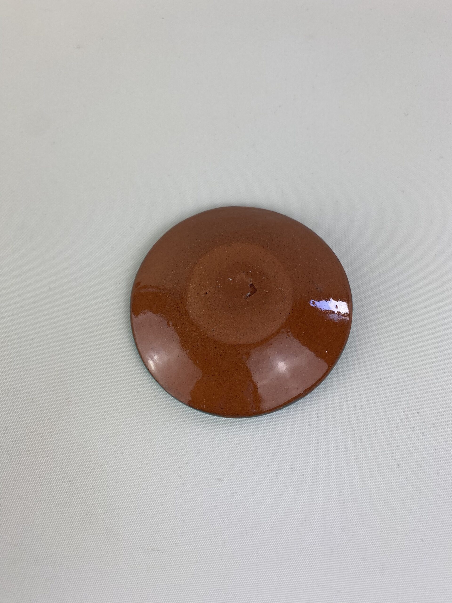 I used terracotta clay which i rolled out, cut out using a round cutter and shaped by using a plaster mold. For the decoration I used coloured slips and bold shapes. To finish off I used a glossy glaze.