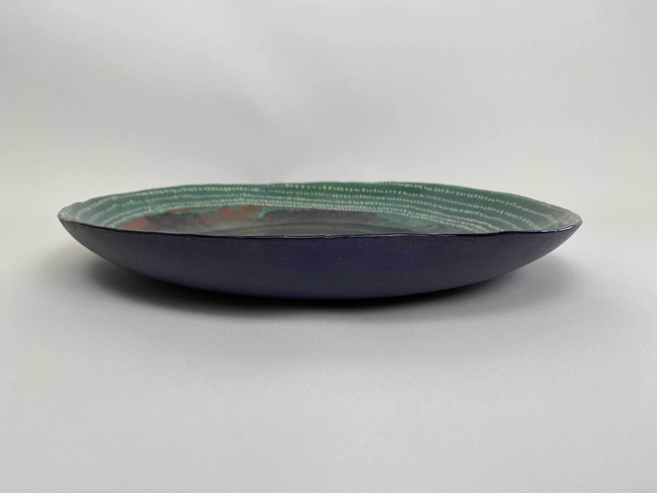 I started by rolling out a slab of clay, being careful to retain the natural circular shape. I then started to decorate. I painted on a green engobe slip for the background. I then cut out a paper disc, painted on slips in a loose pattern, pressed this onto the clay and then peeled back the paper to reveal the design, (this is called mono printing). To bring in a contrast I scratched out a smaller more detailed pattern to frame the design. The outside is decorated in a number of blues to give it depth which I have left unglazed. I finished it off with a wax. For the inside I used a gloss glaze.