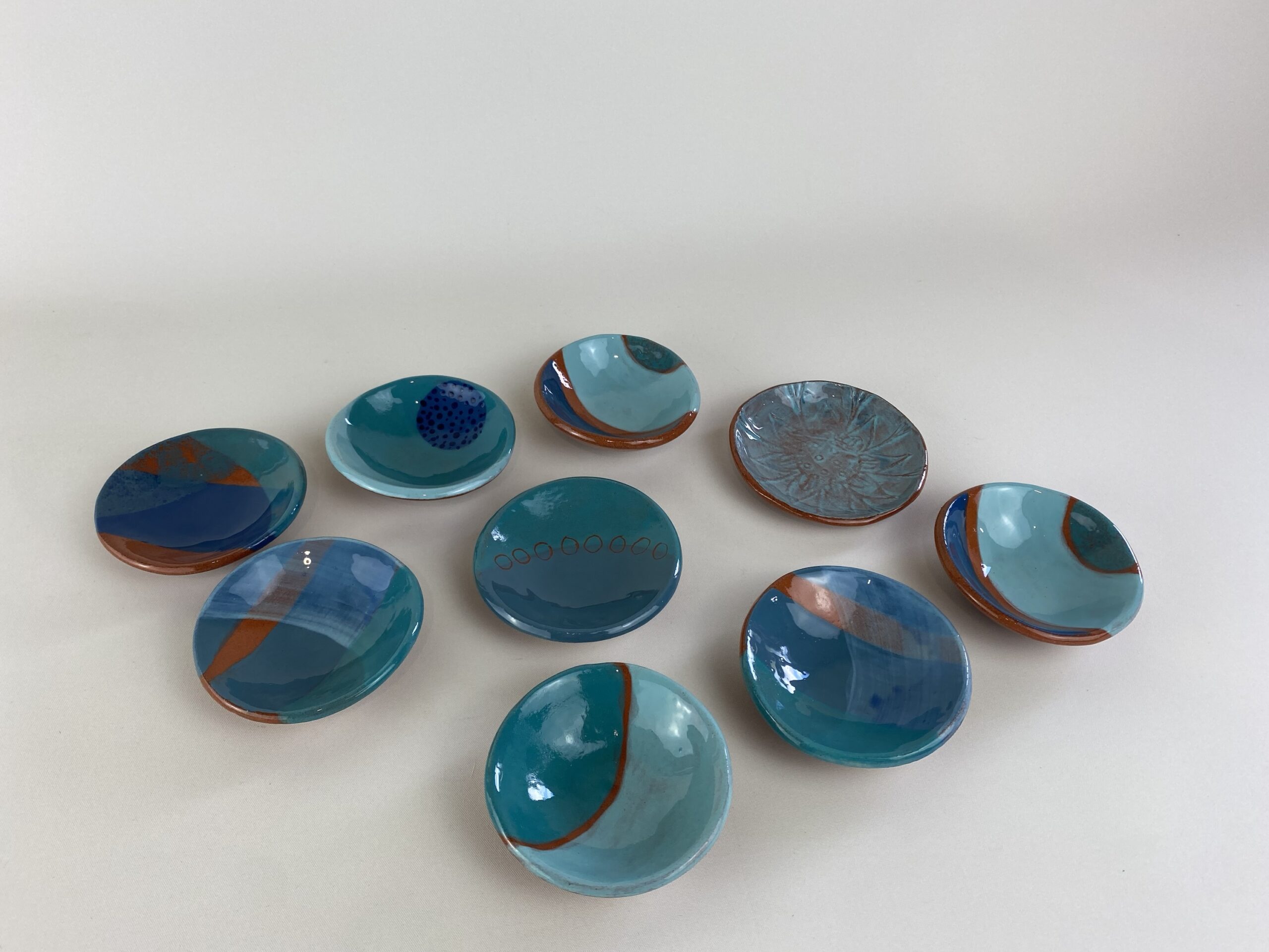 Handmade using white or terracotta earthenware clay, decorated with coloured engobe slips and oxides and finished using a glossy glaze. For purely decorative pieces areas may be left unglazed and finished with a wax. I work in small batches mixing the colours as I go, therefore sets may vary slightly.