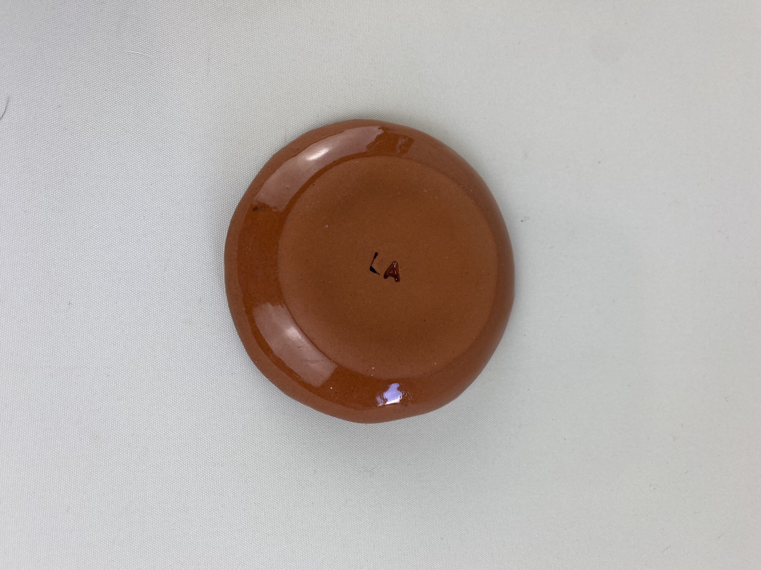 I used terracotta clay which i rolled out, cut out using a round cutter and shaped by using a plaster mold. For the decoration I used coloured slips and bold shapes. To finish off I used a glossy glaze.