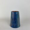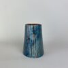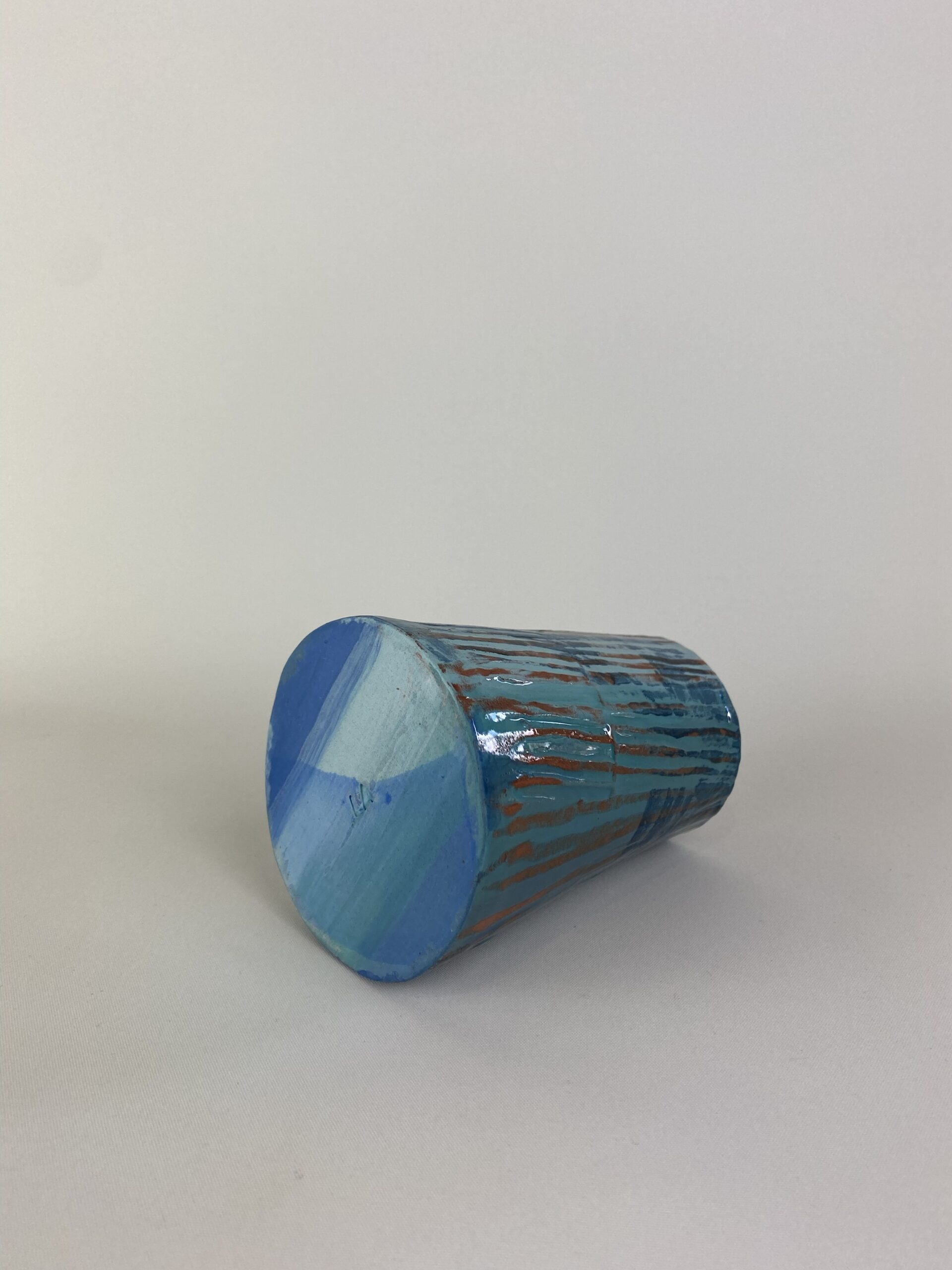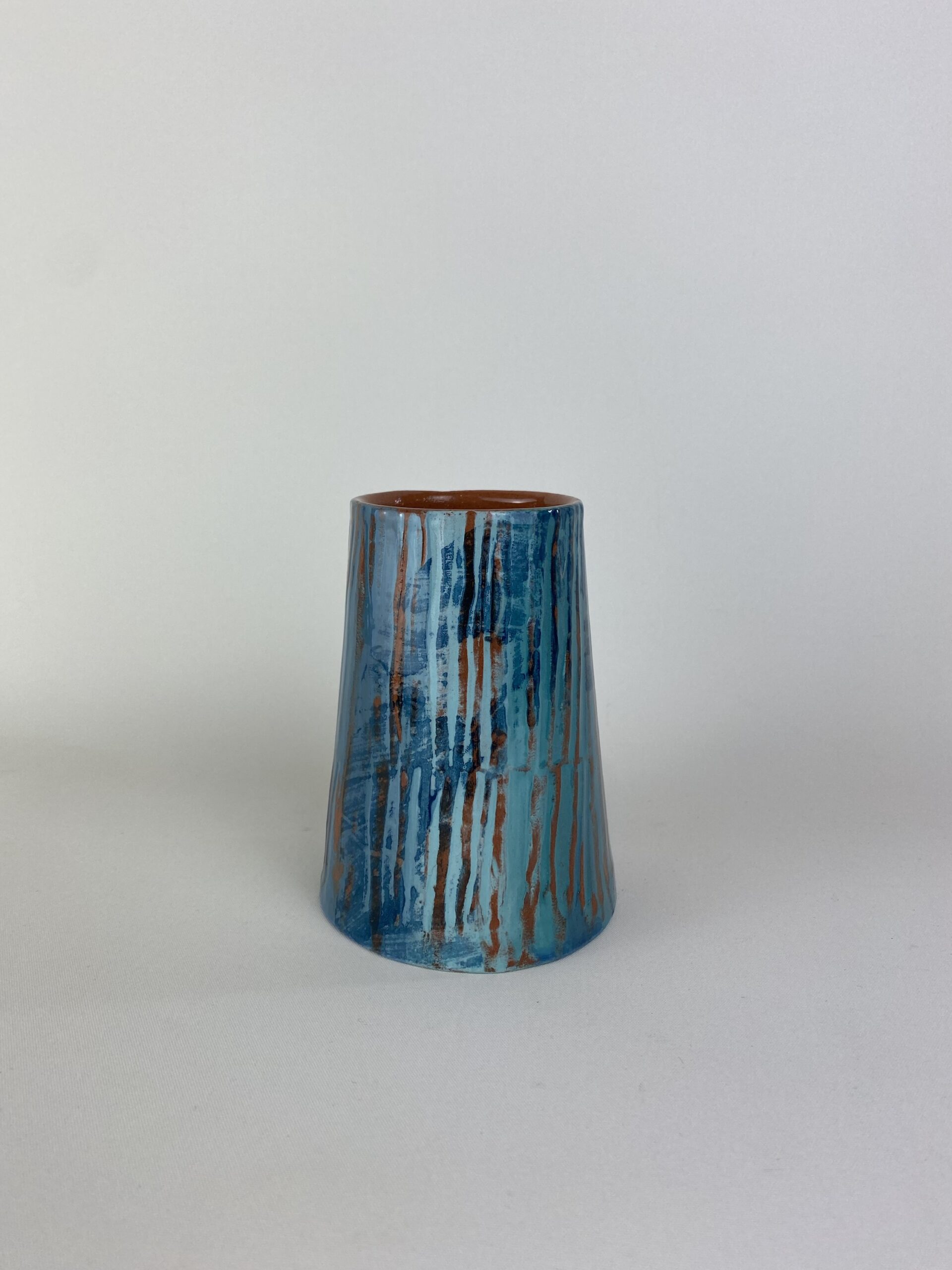For this vase I used terracotta clay which I rolled out into a slab. To decorate I used a few different shades of blue, one layered on top of another to make a varied and textured surface. I finished it off with a glossy glaze.