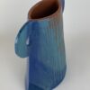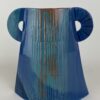 For this vase I used terracotta clay which I rolled into a slab. I cut out the sides and base, stuck them together and attached the handles. I created texture on the body before I assembled it. For the decoration I used a variety of blues and used a mono printing technique. To finish off, I used a gloss glaze.